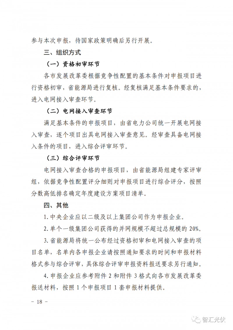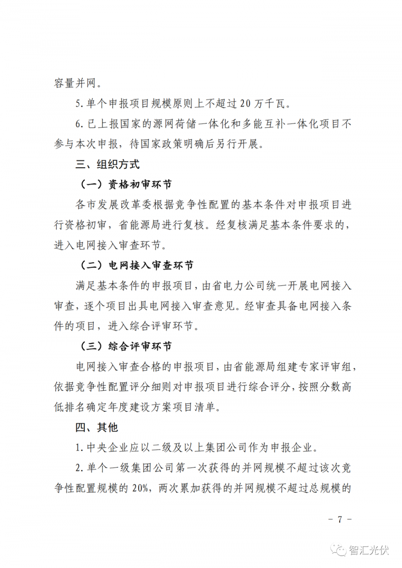 4)光伏項(xiàng)目:?jiǎn)蝹€(gè)申報(bào)項(xiàng)目規(guī)模原則上不超過 20 萬千瓦。單個(gè)一級(jí)集團(tuán)公司第一次獲得的并網(wǎng)規(guī)模不超過該次競(jìng)爭(zhēng)性配置規(guī)模的 20%,兩次累加獲得的并網(wǎng)規(guī)模不超過總規(guī)模的20%。