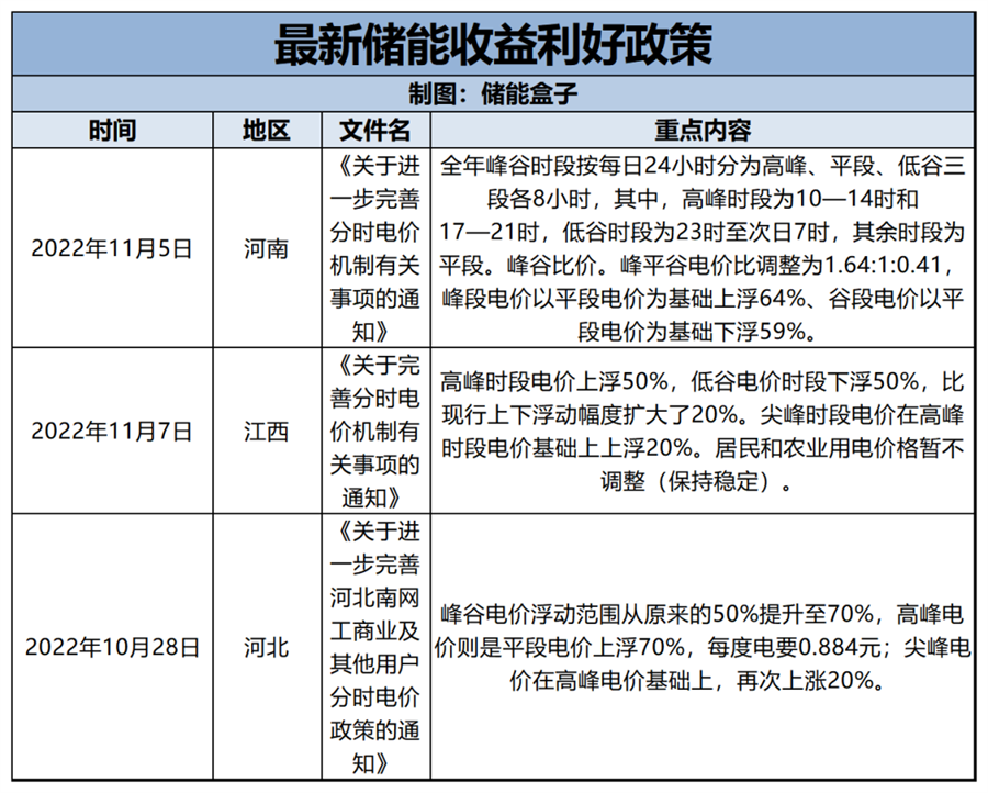 此外,國內(nèi)新能源發(fā)電發(fā)展較為積極的河北、河南、江西等省,也陸續(xù)出臺(tái)了大幅利好儲(chǔ)能收益的新政策。最直觀的政策類型就是拉大峰谷電價(jià)差,提升電價(jià)水平,儲(chǔ)能主要收益大幅提升。