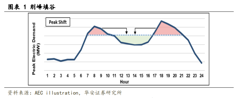 新能源發(fā)電波動性明顯,存在峰值時發(fā)電功率高于電網(wǎng)負荷,產(chǎn)生棄風(fēng)棄光的問題。未來隨新能源裝機比例提升,棄風(fēng)棄光的問題將日益突出。加強電網(wǎng)基建可以提升其負荷,使其可以承載更高功率的發(fā)電。配備發(fā)電側(cè)儲能則可以在電網(wǎng)輸送通道受限和光伏/風(fēng)電滿負荷工作的情況下實現(xiàn)調(diào)峰,平滑新能源發(fā)電輸出曲線,緩解電網(wǎng)負擔(dān)。削峰填谷可以在低需求時段吸收電力,并在高峰需求時段將其釋放到電網(wǎng)或支持客戶的負載。這有效地將一些負荷從高峰時段(紅色)轉(zhuǎn)移到非高峰時段(綠色)。