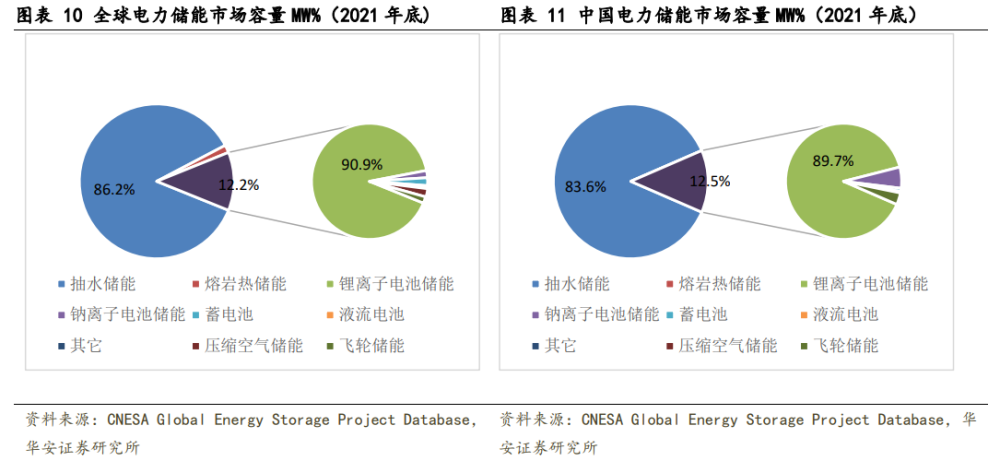 化學(xué)儲能和電化學(xué)儲能統(tǒng)稱為新型儲能,是目前主要主要的發(fā)展方向。電化學(xué)儲能同時具有較高的能量密度和功率密度,決定了其廣泛的技術(shù)適用性。其中,鋰離子電池同時具有高功率密度與高能量密度。根據(jù)CNESA全球儲能項目數(shù)據(jù)庫的統(tǒng)計,截至2021年底,中國各類型儲能裝機量結(jié)構(gòu)與全球情況相似,均以抽水蓄能為主要裝機類型,占據(jù)86%左右裝機容量。全球運行的電力儲能項目容量總計為209.4GW,同比增長 9%。抽水蓄能比重首次低于90%,同比下降4.1個百分點。其次是新儲能,為25.4GW,同比增長67.7%。鋰離子電池在新能源存儲中占比最大,市場份額超過90%。