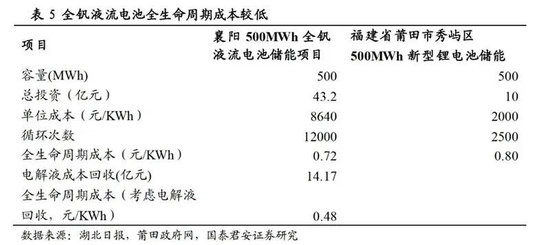 不過,釩電池儲能也有其劣勢,除了當(dāng)下技術(shù)還不夠成熟之外,其初始投入也高于鋰電池等技術(shù)。國泰君安測算了襄陽500MWh全釩液流電池儲能項目與莆田500MWh新型鋰電池儲能項目的投資回收情況,在容量規(guī)模相同的情況下,前者的總投資為43.2億元,而后者為10億元。