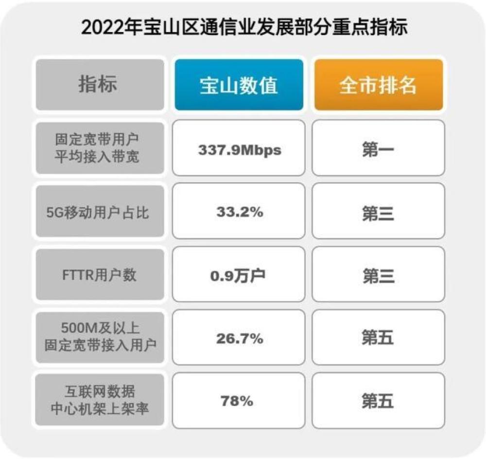 近日,市通信管理局發(fā)布《2022年上海市各行政區(qū)通信業(yè)發(fā)展重點指標(biāo)》,該指標(biāo)共計8項,寶山5項指標(biāo)進入全市前五,其中,寶山固定寬帶用戶平均接入帶寬位列全市第一,5G移動用戶、FTTR用戶數(shù)占比排名全市第三。