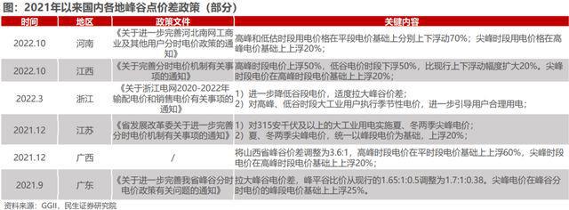 前面提到,終端看政策。2022年12月22日,國家發(fā)改委、國家能源局印發(fā)《關(guān)于做好2023年電力中長期合同簽訂履約工作的通知》,要求各地制定同本地電力供需和市場建設(shè)情況相適應(yīng)的中長期合同分時段價格形成機制,合理拉大峰谷價差,加強中長期與現(xiàn)貨價格機制銜接。自2021年下半年以來,全國已有河南、江西、浙江、河北、山西、廣東、山東等超過20個省市調(diào)整分時電價政策,要求適度拉大峰谷電價差水平。
