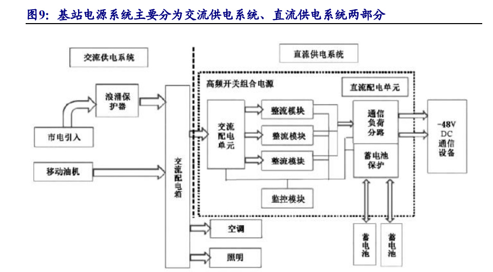 通信儲(chǔ)能作為通信基站的配套基礎(chǔ)設(shè)施,是保障通信系統(tǒng)實(shí)現(xiàn)可靠運(yùn)行的關(guān)鍵。 開(kāi)年以來(lái),北京、上海、深圳、寧夏、大連、吉林等省市宣布 5G 基站建設(shè)目標(biāo),1 月 31 日,北京宣布將在 2023 年新建 1 萬(wàn)個(gè)以上 5G 基站;2 月 8 日,寧夏宣布將在 2023 年新建 5G 基站 2000 個(gè),累計(jì)達(dá)到 13000 個(gè);2 月 11 日,上海計(jì)劃 2023 年新 建 1 萬(wàn)個(gè) 5G 基站;2 月 10 日,深圳市工信局發(fā)布《深圳市極速先鋒城市建設(shè)行動(dòng) 計(jì)劃》,計(jì)劃指出要全面提升 5G 網(wǎng)絡(luò)能效,全年新增 5G 基站 10000 個(gè)。2 月 13 日, 吉林省通信管理局公布 5G 基站相關(guān)數(shù)據(jù):2022 年建成 5G 基站 13042 個(gè),累計(jì)建成 5G 基站 34092 個(gè),并宣布了 2023 年目標(biāo):力爭(zhēng)新建 5G 基站 8000 個(gè)。2 月 14 日, 大連市通信管理局宣布全年全域?qū)⑿陆?5G 基站 4000 個(gè)以上,力爭(zhēng)年底建成 19000 個(gè) 5G 基站,重點(diǎn)場(chǎng)所網(wǎng)絡(luò)通達(dá)率提升至 99%。 我國(guó) 5G 基站的建設(shè)運(yùn)營(yíng)模式主要采用中國(guó)鐵塔建塔、引電建設(shè)基礎(chǔ)配套設(shè)施, 移動(dòng)、聯(lián)通、電信三大主運(yùn)營(yíng)商租塔、安裝設(shè)備并進(jìn)行網(wǎng)絡(luò)運(yùn)營(yíng)的模式,運(yùn)營(yíng)電費(fèi) 由鐵塔代運(yùn)營(yíng)商統(tǒng)一向電力部門繳納。5G 基站開(kāi)通后電費(fèi)成本開(kāi)支已高于鐵塔租費(fèi), 較大的 5G 基站耗電量已經(jīng)成為阻礙 5G 和制約行業(yè)發(fā)展的一個(gè)重要因素。利用儲(chǔ)能 裝置在負(fù)荷高峰時(shí)期放電,負(fù)荷低谷時(shí)期從電網(wǎng)充電,減少高峰負(fù)荷需求,節(jié)省用電費(fèi)用,從而達(dá)到改善負(fù)荷特性、參與系統(tǒng)調(diào)峰的目的,同時(shí)節(jié)省電費(fèi)、最大限度 套利。 基站電源系統(tǒng)主要分為交流供電系統(tǒng)、直流供電系統(tǒng)兩部分。交流供電系統(tǒng)包 含市電引入、移動(dòng)油機(jī)、浪涌保護(hù)器、交流配電箱等。直流供電系統(tǒng)包含高頻開(kāi)關(guān) 組合電源,蓄電池等。