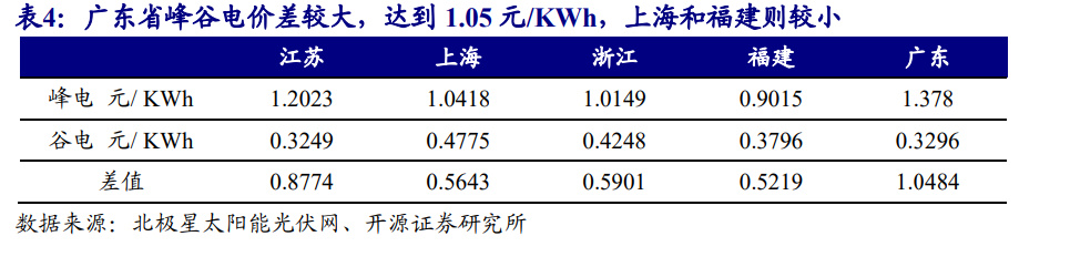 目前儲(chǔ)能站盈利模式的其中一類是采取峰谷電價(jià)套利模式,即儲(chǔ)能站在谷時(shí)充 電,峰時(shí)放電,以此補(bǔ)平電網(wǎng)負(fù)荷曲線的同時(shí)獲取峰谷電價(jià)差值的收益。 參考 2023 年各省電網(wǎng)企業(yè)代理購(gòu)電價(jià)格來(lái)看,江蘇、上海、浙江、福建、廣東 等省為代表性較強(qiáng)的省份,選取谷時(shí)和高峰時(shí)段電價(jià)進(jìn)行比較,上海和福建的峰谷 電價(jià)差值較小,僅為 0.56 元、0.52 元/KWh,而廣東則價(jià)差較大,達(dá)到 1.05 元/KWh。