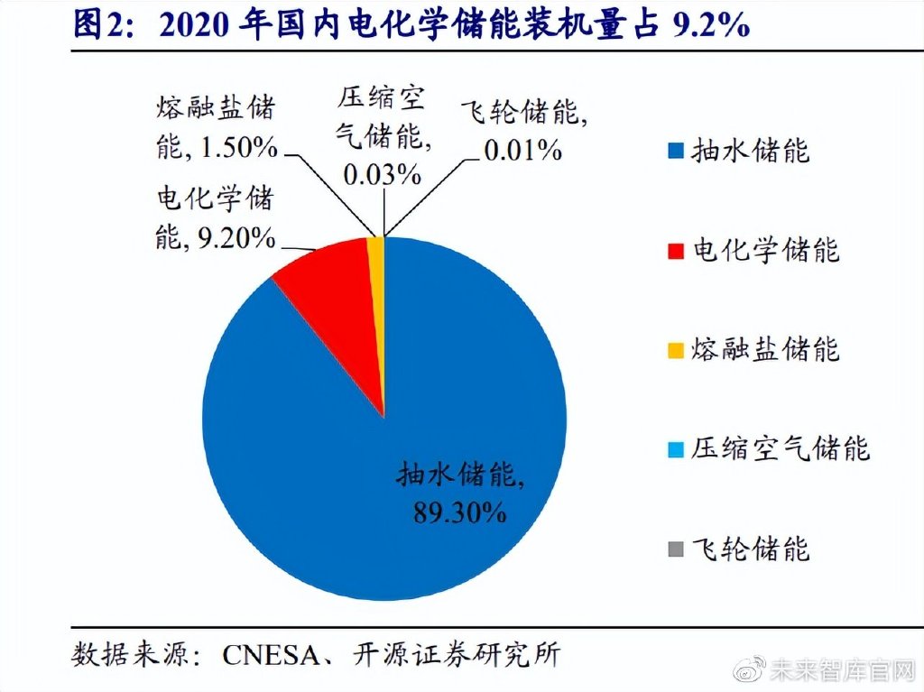 從儲(chǔ)能方式來(lái)看,抽水儲(chǔ)能為目前國(guó)內(nèi)累計(jì)裝機(jī)規(guī)模最大的蓄能方式,占比達(dá) 到了 89.3%;其次是電化學(xué)儲(chǔ)能,裝機(jī)規(guī)模占比為 9.2%。熔融鹽儲(chǔ)熱裝機(jī)規(guī)模占比為1.5%;壓縮空氣儲(chǔ)能和飛輪儲(chǔ)能裝機(jī)規(guī)模占比都小于 0.1%。電化學(xué)儲(chǔ)能中,鋰電池仍 為主導(dǎo)儲(chǔ)能形式,占總量 88.8%,鉛蓄電池為第二大分支,占到 10.2%。