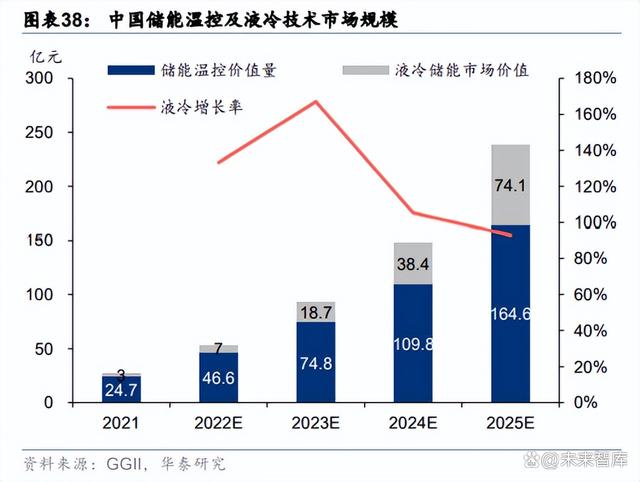 液冷針對大儲優(yōu)勢凸顯,未來市場規(guī)模將快速提升。液冷在技術(shù)上具備優(yōu)勢,當(dāng)前大容量、 高功率儲能系統(tǒng)的快速應(yīng)用,對于儲能系統(tǒng)散熱效率要求更高。液冷技術(shù)相比于傳統(tǒng)風(fēng)冷 散熱效率更高,同時噪音更小、能耗更低,具有顯著優(yōu)勢,單位價值量相比風(fēng)冷也會有明 顯提升。隨著儲能電站大型化、集約化的不斷發(fā)展,儲能系統(tǒng)大容量、高密度的趨勢不斷 凸顯,未來液冷市場規(guī)模預(yù)計會快速增長。根據(jù) GGII,2021 年中國儲能溫控市場整體規(guī)模 為 24.7 億元,液冷溫控市場規(guī)模 3 億元。GGII 預(yù)計到 2025 年,中國儲能溫控市場總規(guī)模 將達到 164.6 億元,液冷儲能市場價值將達到 74.1 億元,占比約 45.1%,年復(fù)合增長率超 過 89%。