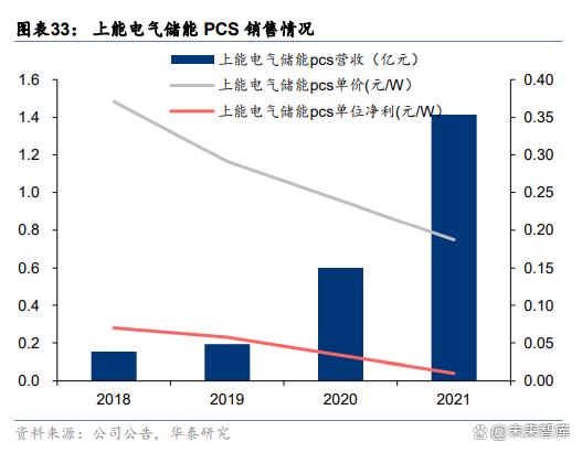 大儲是 B 端市場,廠商價格直面競爭,產(chǎn)品優(yōu)勢公司脫穎而出。儲能 PCS 在初期單價和毛 利率較高,隨著頭部廠商不斷擴產(chǎn)和新的廠商不斷進入,產(chǎn)業(yè)競爭加劇,價格和毛利率逐 漸走低。上能電氣 2018 年儲能 PCS 營收 0.15 億元,產(chǎn)品單價 0.37 元/W,2022 年儲能 PCS 營收 1.42 億元,較 2018 年增長近 9 倍,產(chǎn)品單價 0.19 元/W,降幅 50%,規(guī)模效應(yīng) 盡顯。陽光電源光伏逆變器價格穩(wěn)中有降,由 2018 年 0.22 元/W 降至 2022 年 0.19 元/W。