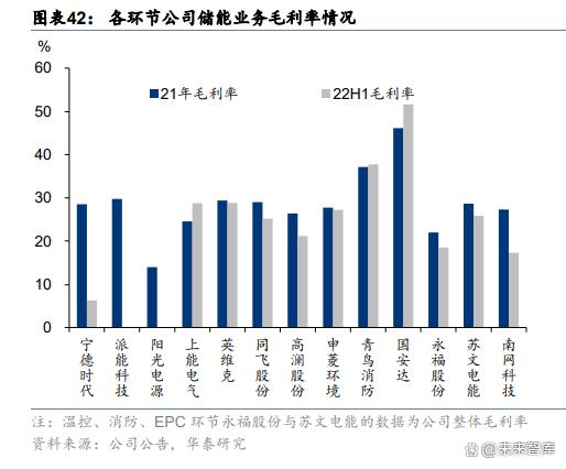 各環(huán)節(jié) 22H1 毛利率相比 21 年全年普遍走低,消防環(huán)節(jié)毛利率水平最高。21 年電芯環(huán)節(jié) 兩家企業(yè)儲能業(yè)務(wù)毛利率處于 28%-30%,22H1 受到上游鋰礦價格高漲且傳導(dǎo)滯后影響, 盈利空間被顯著壓縮,以寧德時代為例,22H1 毛利率下滑至 6.43%。消防環(huán)節(jié)毛利率最高, 且兩家公司 22H1 毛利率相比 21 年均有提升,我們認為主要系公司產(chǎn)品結(jié)構(gòu)優(yōu)化致整體毛 利率水平抬升。儲能 PCS 及系統(tǒng)集成環(huán)節(jié)內(nèi)各公司由于業(yè)務(wù)結(jié)構(gòu)及出貨市場的不同毛利率 水平差異較大,陽光電源/上能電氣 2021 年儲能業(yè)務(wù)毛利率水平分別為 14.11% /24.52%。 溫控環(huán)節(jié)毛利率普遍在 25%-30%之間。EPC 環(huán)節(jié) 21 年毛利率普遍在 20%-30%之間,22H1 毛利率水平出現(xiàn)明顯下滑。