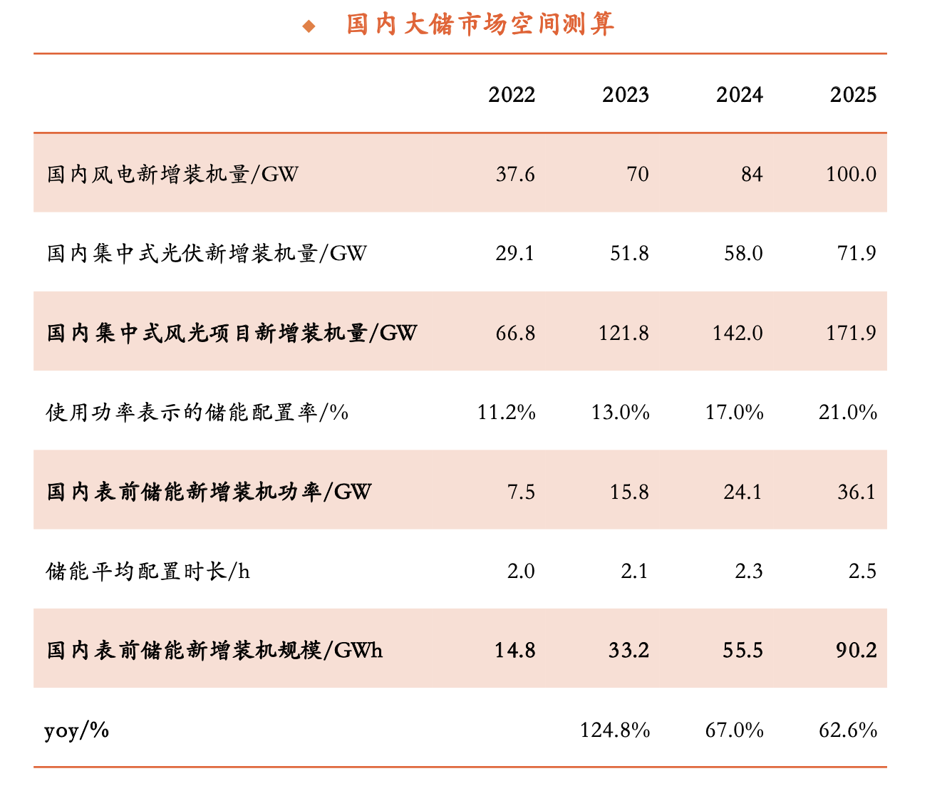 根據(jù)平安證券測算,假設(shè)2023/2024/2025年儲能配置率分別為13%/17%/21%,時(shí)長分別為2.1h/2.3h/2.5h。今年國內(nèi)大儲新增裝機(jī)有望達(dá)到33.2GWh,同比增長124.8%;到2025年,國內(nèi)大儲新增裝機(jī)量有望進(jìn)一步增長至90.2GWh,2022-2025年復(fù)合增長率達(dá)83%。