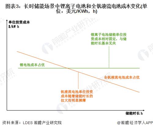 根據(jù)長(zhǎng)時(shí)儲(chǔ)能委員會(huì) ( LDES ) 與麥肯錫 2021 年底聯(lián)合發(fā)布的報(bào)告,由于配套的儲(chǔ)能時(shí)長(zhǎng)較長(zhǎng),長(zhǎng)時(shí)儲(chǔ)能在考慮投資成本時(shí)更加注重單位能量 ( 每 Wh ) 的投資成本而非單位功率 ( 每 W ) 的投資成本。隨著儲(chǔ)能時(shí)長(zhǎng)的增加,全釩液流電池系統(tǒng)的單位成本將得到明顯攤薄 ( 功率單元成本不變,僅需增加能量單元 ) ,而鋰電池系統(tǒng)的單位成本則基本固定。因此,從成本角度,釩液流電池在長(zhǎng)時(shí)儲(chǔ)能的場(chǎng)景中較當(dāng)前主流的鋰離子電池具備一定的比較優(yōu)勢(shì)。