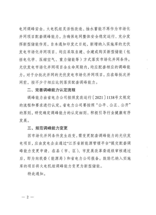 4月17日,江蘇省發(fā)展改革委發(fā)布《關于進一步做好光伏發(fā)電市場化并網(wǎng)項目配套調(diào)峰能力建設有關工作的通知》(文件原文附后),文件提出: