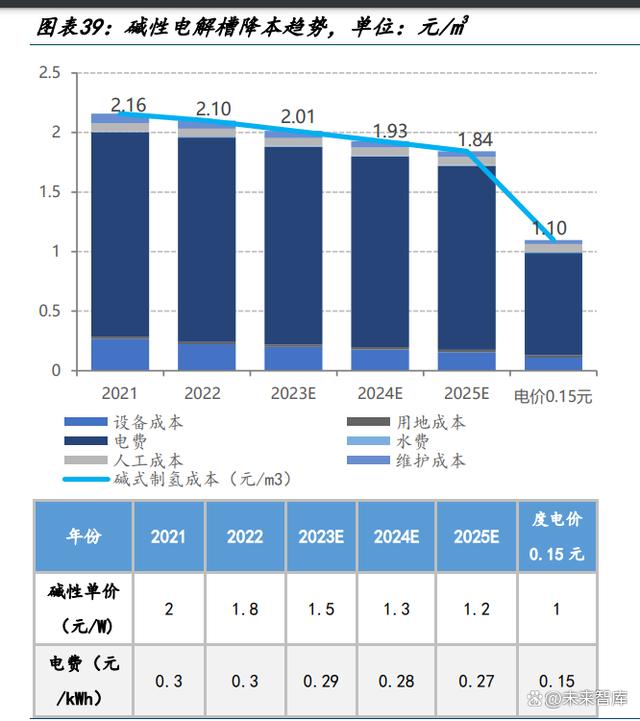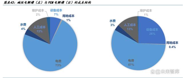 (2)從發(fā)展階段來(lái)看,示范階段更注重初裝成本,商業(yè)化運(yùn)營(yíng)需考慮全生命周期成 本。當(dāng)前電解水項(xiàng)目大多處于示范階段,堿性電解槽技術(shù)更成熟、設(shè)備價(jià)格也相對(duì)更 低,示范階段更傾向于堿性電解槽的應(yīng)用。未來(lái)進(jìn)入商業(yè)化運(yùn)營(yíng)時(shí),全生命周期成本 成為首要考慮因素,即需加入運(yùn)營(yíng)成本進(jìn)行考量,堿性電解槽運(yùn)營(yíng)成本占其全生命周 期成本的 75%-80%,PEM 則是占 30-40%,在 PEM 電解槽設(shè)備逐年降本以及其更適合與 風(fēng)光耦合的情況下,PEM 電解槽的應(yīng)用將呈現(xiàn)逐年上升趨勢(shì)。