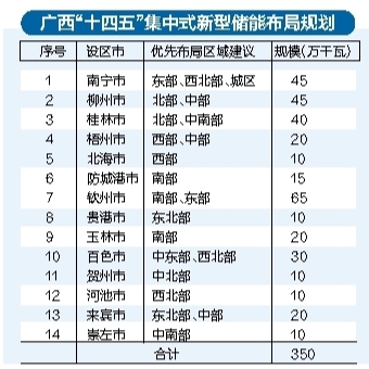 近日,自治區(qū)發(fā)展改革委印發(fā)《廣西新型儲能發(fā)展規(guī)劃(2023—2030年)》(以下簡稱《規(guī)劃》)。從廣西“十四五”集中式新型儲能布局規(guī)劃(見下表)來看,欽州市將建設(shè)65萬千瓦新型儲能,居全區(qū)第一;南寧優(yōu)先在東部、西北部、城區(qū)布局,建設(shè)45萬千瓦新型儲能,建設(shè)規(guī)模和柳州持平,均居全區(qū)第二。