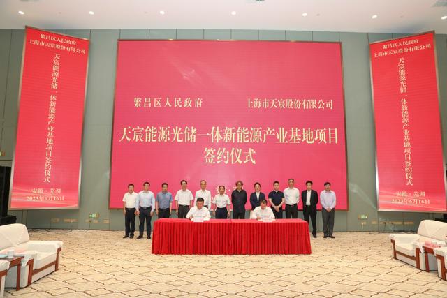 近日,總投資116億元的天宸能源光儲一體新能源產業(yè)基地項目正式簽約。省政府駐滬辦黨組成員、副主任賀東,天宸股份有限公司董事長葉茂菁、副董事長王學進,省生態(tài)環(huán)境廳副廳長羅宏,蕪湖市副市長向繼輝,市政府秘書長王志鵬,繁昌區(qū)委書記瞿輝,區(qū)長許有龍等見證項目簽約。