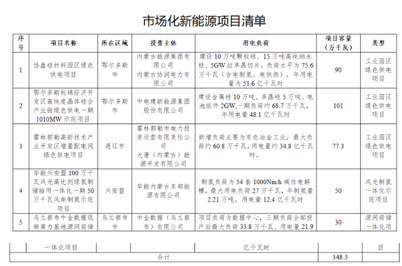 按照《內(nèi)蒙古自治區(qū)工業(yè)園區(qū)綠色供電項目實施細(xì)則(2022年版)》《內(nèi)蒙古自治區(qū)風(fēng)光制氫一體化項目實施細(xì)則(2022年版)》《內(nèi)蒙古自治區(qū)源網(wǎng)荷儲一體化項目實施細(xì)則(2022年版)》要求,我局組織專家對各盟市申報的5個市場化新能源項目方案進(jìn)行了評估,5個項目均納入市場化新能源項目清單,共配建新能源規(guī)模348.3萬千瓦,其中風(fēng)電259萬千瓦、光伏89.3萬千瓦。經(jīng)報請自治區(qū)人民政府同意,現(xiàn)將市場化新能源項目清單印發(fā)你們,并將有關(guān)要求通知如下。