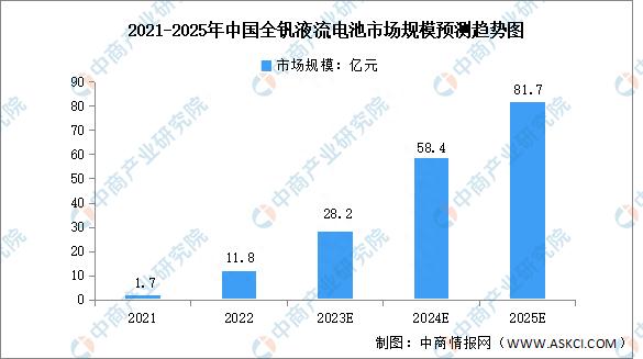 全釩液流電池的市場空間主要來自于儲能需求的增長以及自身滲透率的提升,隨著技術(shù)的進(jìn)步及生產(chǎn)成本的降低,全釩液流電池市場空間將逐步擴(kuò)大。數(shù)據(jù)顯示,2022年全釩液流電池市場規(guī)模約11.8億元,中商產(chǎn)業(yè)研究院分析師預(yù)測,2023年我國全釩液流電池市場規(guī)模將達(dá)28.2億元,預(yù)計2025年將增至81.7億元,2021-2025年復(fù)合年均增長率達(dá)163.3%。