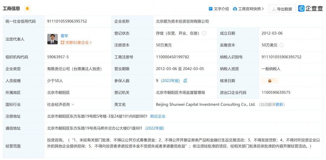 資料顯示,順為資本的機(jī)構(gòu)主體是北京順為資本投資咨詢有限公司,由雷軍先生和許達(dá)來先生創(chuàng)立于2011年,法定代表人為小米集團(tuán)董事長雷軍。