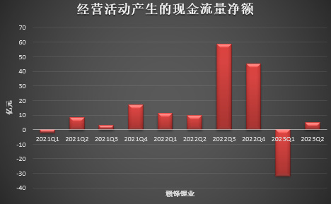 好在二季度,隨著鋰價在30萬元/噸企穩(wěn),中下游廠商在一季度過度去庫存以后,二季度的采購也有所回調(diào),贛鋒鋰業(yè)的經(jīng)營活動現(xiàn)金流因此也有所回暖,重新回歸正數(shù)達(dá)到4.78億元,但是相較去年同期的高景氣水平依舊有較大差距。