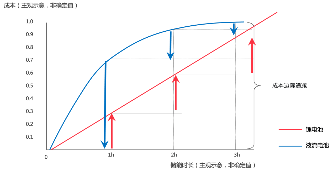 相較動(dòng)輒發(fā)生安全事故的鋰電池,液流電池不燃燒、不爆炸,本征安全優(yōu)勢(shì)突出。其儲(chǔ)能時(shí)長(zhǎng)大于2小時(shí),使用壽命超過(guò)20年,循環(huán)次數(shù)超過(guò)15000次等優(yōu)勢(shì),更適合未來(lái)大量使用新能源的電網(wǎng),也被視為最適合長(zhǎng)時(shí)儲(chǔ)能的電池技術(shù)之一。并且,隨著儲(chǔ)能時(shí)長(zhǎng)的增加,液流電池的投資成本邊際遞減。