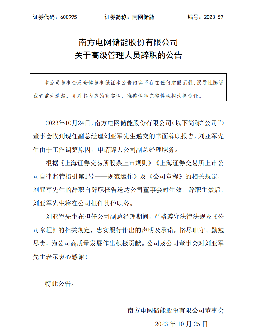 南網儲能公告稱,10月24日,公司董事會收到現(xiàn)任副總經理劉亞軍先生遞交的書面辭職報告,劉亞軍先生由于工作調整原因,申請辭去公司副總經理職務。