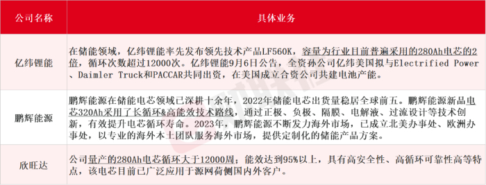 據(jù)財(cái)聯(lián)社不完全整理,出口海外的儲能電芯A股上市公司主要為億緯鋰能、鵬輝能源、欣旺達(dá)等,還包括自研電芯配套戶儲終端產(chǎn)品的企業(yè),如比亞迪、派能科技等。而另一邊,儲能電池出海的風(fēng)吹向了大儲,截至目前,已經(jīng)有包括瑞浦蘭鈞、遠(yuǎn)景動力、海辰儲能、億緯鋰能等多家企業(yè)獲海外儲能集成商大單,單筆最大訂單已達(dá)10GWh。A股上市公司具體業(yè)務(wù)如下: