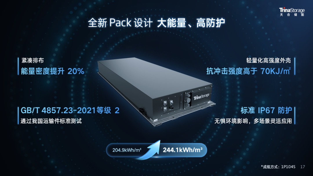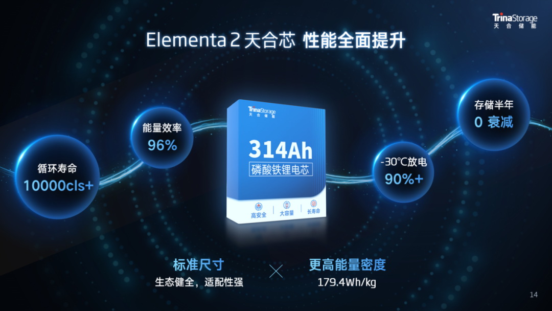 通過(guò)優(yōu)化電芯結(jié)構(gòu)和智造工藝,天合自研高安全、高能量密度的314Ah儲(chǔ)能專(zhuān)用電芯,循環(huán)壽命可達(dá)10000cls+,能量密度179.4Wh/kg,能量效率高達(dá)96%,同時(shí)采用主流標(biāo)準(zhǔn)的71173尺寸,完美適配當(dāng)前主流系統(tǒng)集成方案,實(shí)現(xiàn)同尺寸下系統(tǒng)能量的顯著提升。