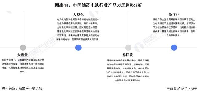 隨著中國儲能電池行業(yè)的快速發(fā)展,大容量、大型化、易回收和數字化將成為儲能電池主要的發(fā)展方向。在大容量方面,同等規(guī)模下儲能器件的大容量可以減少單體電池使用數量,降低單體電池一致均衡的難度,從而降低電池發(fā)生熱失控乃至起火的概率;在大型化方面,大型化是配置靈活的電化學儲能技術在電力系統(tǒng)中發(fā)揮主導的作用的必經之路;在易回收方面,研制易回收的儲能電池體系,使回收收益具備吸引力是未來發(fā)展大方向;在數字化方面,儲能產品全生命周期數字化信息既可以向上為電網調度及監(jiān)控提供重要支撐,也可以向下為核心部件的狀態(tài)診斷、性能提升提供數據參考。
