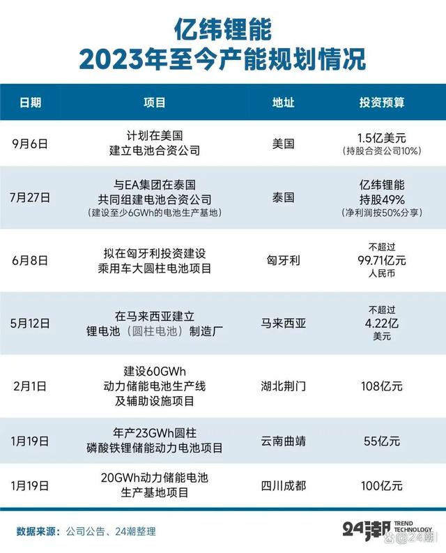 另?yè)?jù)24潮團(tuán)隊(duì)統(tǒng)計(jì),在5月、6月和7月億緯鋰能三次發(fā)布擴(kuò)張公告,其計(jì)劃投入上百億資金在馬來(lái)西亞、匈牙利和泰國(guó)獨(dú)資或合資建設(shè)電池基地項(xiàng)目,詳見(jiàn)下表