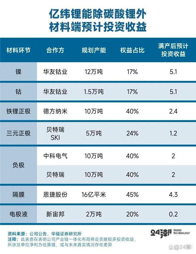 據(jù)華福證券預(yù)測(cè),2022年億緯鋰能碳酸鋰可自供量約為2779噸,自供比列約為14%,未來(lái)還將逐年快速提升,至2024年其碳酸鋰自供比例將升至33%,根據(jù)其長(zhǎng)遠(yuǎn)產(chǎn)能規(guī)劃,未來(lái)很可能達(dá)到49%;而億緯鋰能在上游鈷鎳、正負(fù)極材料、隔膜以及電解液等材料領(lǐng)域的產(chǎn)業(yè)布局一旦滿(mǎn)產(chǎn)后,預(yù)計(jì)合計(jì)將實(shí)現(xiàn)22.3億元的投資收益。
