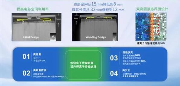從電池技術角度來看,瑞浦蘭鈞 320Ah 問頂儲能電池采用首創(chuàng)的問頂技術,通過電池內部結構創(chuàng)新設計、雙高電極、電化學體系創(chuàng)新等,讓電池的頂部空間從 15mm 降低到 8mm,空間利用率有效提升 7% 以上,極耳長度從 32mm 縮短到 13mm,以及應用了雙高固液態(tài)界面設計,使得鋰離子傳輸速度提升 30%。另外,其體積能量密度也隨之提高 10%,原材料及部件成本節(jié)省 5%,無 U 型彎折有著更穩(wěn)定的結構,全方位實現高容量、高安全、高效率、長壽命等性能升級。