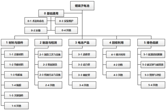 鋰離子電池綜合標(biāo)準(zhǔn)化技術(shù)體系主要包括基礎(chǔ)通用、材料與部件、制造與檢測(cè)、電池產(chǎn)品、回收利用、綠色低碳6大類(lèi)、25個(gè)小類(lèi)(見(jiàn)圖2)。