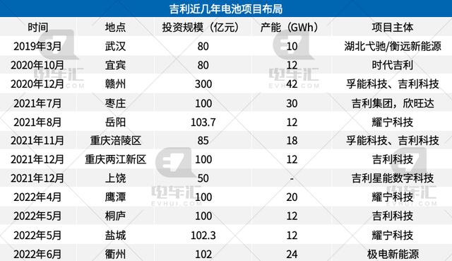 吉利近幾年電池業(yè)務布局(據(jù)公開報道統(tǒng)計)