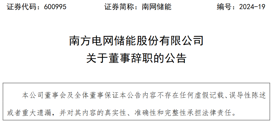 南網(wǎng)儲(chǔ)能于4月16日發(fā)布晚間公告稱,2024年4月16日,南方電網(wǎng)儲(chǔ)能股份有限公司(以下簡稱“公司”)董事會(huì)收到非獨(dú)立董事江裕熬先生遞交的書面辭職報(bào)告,江裕熬先生由于達(dá)到法定退休年齡,申請辭去公司董事及董事會(huì)科技創(chuàng)新委員會(huì)委員職務(wù)。