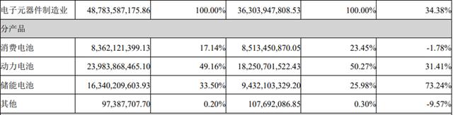 由于多數(shù)訂單為長期合同,儲能電池業(yè)務(wù)受價(jià)格戰(zhàn)影響較小,營業(yè)收入達(dá)到163.4億元,同比增長73.24%,占總營收的33.5%,毛利率也提升了8.07個(gè)百分點(diǎn)至17.03%。