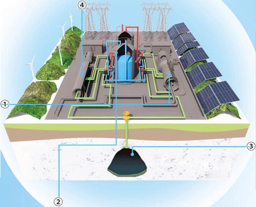 第四步 釋放、加熱鹽穴內(nèi)高壓空氣,驅(qū)動膨脹機帶動發(fā)電機發(fā)電 應(yīng)用多級高負荷透平膨脹機設(shè)計技術(shù),攻克全三維設(shè)計、復(fù)雜軸系結(jié)構(gòu)、動態(tài)調(diào)節(jié)與控制等關(guān)鍵技術(shù),研制出的300兆瓦級膨脹機,具有負荷高、流量大、流動傳熱復(fù)雜等特點。