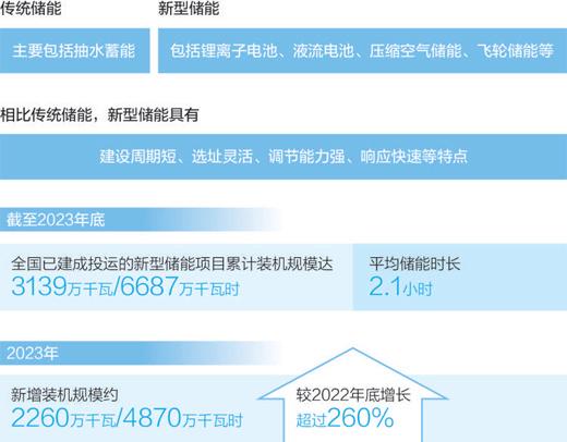 今年的《政府工作報告》提出,發(fā)展新型儲能。新型儲能是實現(xiàn)碳達峰碳中和目標的重要支撐,包括鋰離子電池、液流電池、壓縮空氣儲能、飛輪儲能等,具有建設(shè)周期短、選址靈活、調(diào)節(jié)能力強、響應(yīng)快速等特點。國家能源局數(shù)據(jù)顯示,截至2023年底,全國已經(jīng)建成投運新型儲能項目累計裝機規(guī)模達3139萬千瓦/6687萬千瓦時,平均儲能時長2.1小時;2023年新增裝機規(guī)模約2260萬千瓦/4870萬千瓦時,較2022年底增長超過260%。