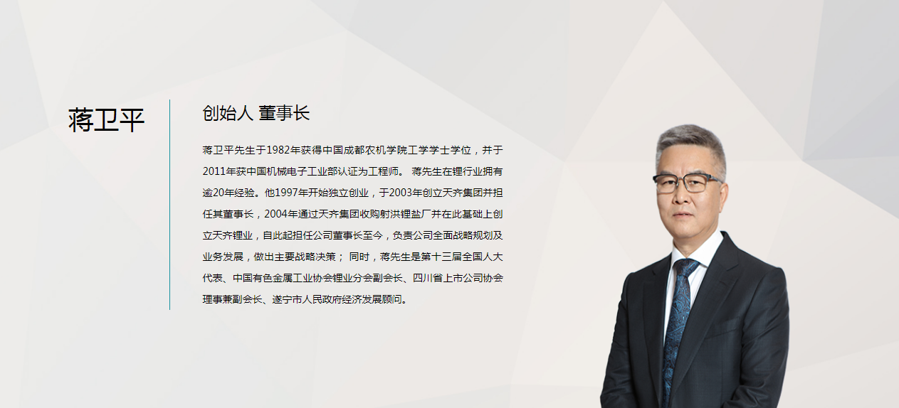 蔣衛(wèi)平為公司創(chuàng)始人及實(shí)際控制人,自2007年12月起擔(dān)任公司董事長(zhǎng),主要負(fù)責(zé)公司全面戰(zhàn)略規(guī)劃及業(yè)務(wù)發(fā)展,并負(fù)責(zé)主要戰(zhàn)略決策。蔣衛(wèi)平為公司規(guī)范運(yùn)作和長(zhǎng)期健康發(fā)展發(fā)揮了積極作用。此外,蔣衛(wèi)平憑借前瞻性的戰(zhàn)略眼光和豐富的行業(yè)及管理實(shí)踐,帶領(lǐng)公司積極布局全球鋰電材料資源和加工產(chǎn)能,使公司逐步發(fā)展成為全球鋰行業(yè)的頭部企業(yè)?;谑Y衛(wèi)平為公司發(fā)展做出的杰出貢獻(xiàn),董事會(huì)同意聘任蔣衛(wèi)平為公司董事會(huì)名譽(yù)主席,繼續(xù)就公司戰(zhàn)略規(guī)劃及業(yè)務(wù)發(fā)展作出指導(dǎo)和決策支持。