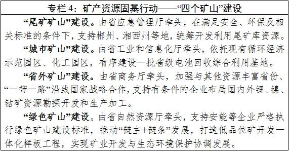 統(tǒng)籌開展鋰電池及先進(jìn)儲(chǔ)能材料產(chǎn)業(yè)所需鋰、錳、鎳等主要礦產(chǎn)資源調(diào)查評(píng)價(jià)及勘查,加強(qiáng)新能源礦產(chǎn)資源儲(chǔ)備和統(tǒng)籌開發(fā)利用。建設(shè)“尾礦礦山”,在滿足安全、環(huán)保及相關(guān)標(biāo)準(zhǔn)的條件下,支持開發(fā)利用尾礦庫(kù)資源。建設(shè)“城市礦山”,依托現(xiàn)有循環(huán)經(jīng)濟(jì)示范園區(qū)、省級(jí)化工園區(qū),有序建設(shè)一批電池回收綜合利用示范基地。加強(qiáng)與其他資源豐富省份戰(zhàn)略合作,支持有條件的企業(yè)布局建設(shè)“省外礦山”,提升資源供應(yīng)保障能力。