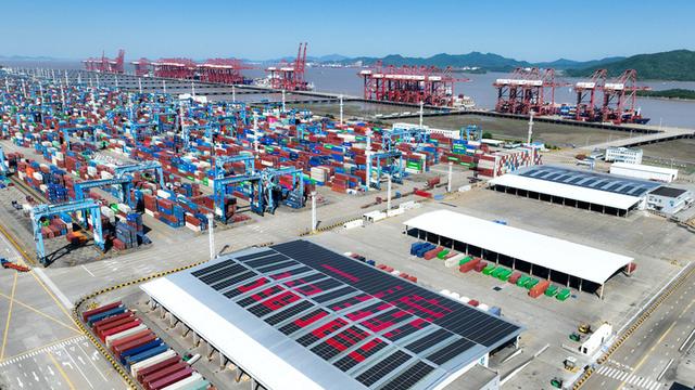 炎炎夏日,寧波舟山港梅山港區(qū)“綠意”正盎然:百米風(fēng)機悠然轉(zhuǎn)動,清潔能源設(shè)備高效運行,岸電設(shè)施源源不斷地為集裝箱貨輪提供電能,搭載太陽能光伏發(fā)電系統(tǒng)的10臺遠(yuǎn)控橋吊有序作業(yè)……綠色碼頭初具雛形。