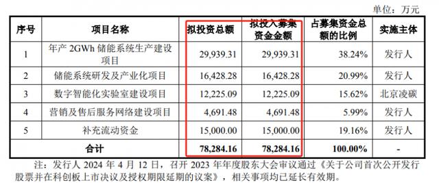 其中29939.31萬元用于年產2GWh儲能系統(tǒng)生產建設項目,16428.28萬元用于儲能系統(tǒng)研發(fā)及產業(yè)化項目,12225.09萬元用于數字智能化實驗室建設項目,4691.48萬元用于營銷及售后服務網絡建設項目,15000萬元用于補充流動資金。