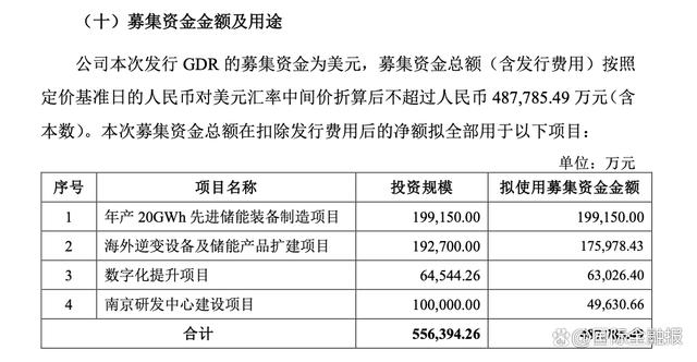 此次發(fā)行GDR的募集資金為美元,募集資金總額(含發(fā)行費用)折算后不超過人民幣48.78億元。所募資金在扣除發(fā)行費用后,將全部用于年產(chǎn)20GWh先進儲能裝備制造項目、海外逆變設備及儲能產(chǎn)品擴建項目、數(shù)字化提升項目以及南京研發(fā)中心建設項目。