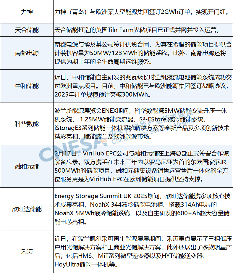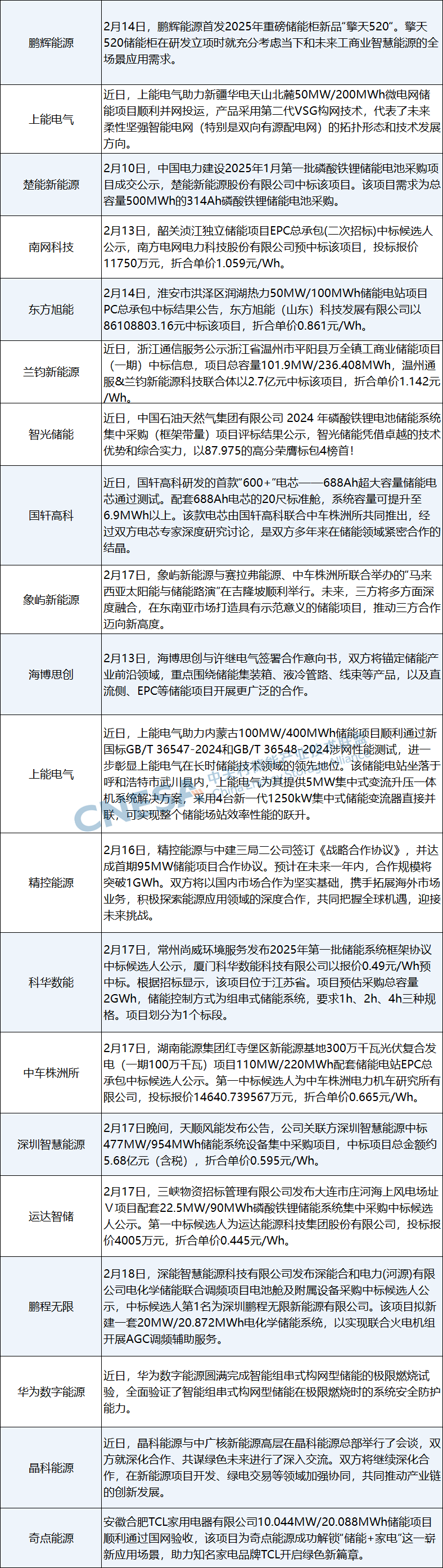 近兩周來,楚能新能源、南網(wǎng)科技、中車株洲所、蘭鈞新能源、智光儲(chǔ)能、科華數(shù)能、運(yùn)達(dá)智儲(chǔ)、鵬程無限等企業(yè)中標(biāo)國(guó)內(nèi)儲(chǔ)能項(xiàng)目采購;上能電氣、奇點(diǎn)能源等項(xiàng)目順利并網(wǎng);華為數(shù)字能源圓滿完成智能組串式構(gòu)網(wǎng)型儲(chǔ)能的極限燃燒試驗(yàn);晶科能源與中廣核新能源深化了合作;鵬輝能源首發(fā)2025年工商業(yè)儲(chǔ)能柜新品“擎天520“;海博思創(chuàng)與許繼電氣錨定儲(chǔ)能產(chǎn)業(yè)前沿領(lǐng)域開展廣泛合作等等,國(guó)內(nèi)市場(chǎng)在招中標(biāo)、戰(zhàn)略合作、新品發(fā)布等方面全面出擊。