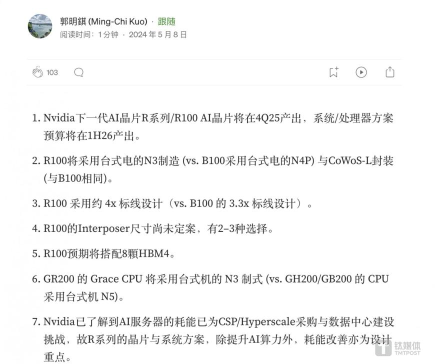 天風國際證券分析師郭明錤指出,英偉達下一代R系列/R100 AI芯片將于2025年第四季度量產,采用臺積電3nm制程、4個reticle設計,搭配8顆HBM4,重點改善能耗。最早在明年,R100 AI GPU就將登場。