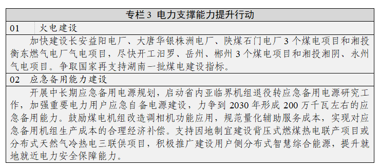 (八)提升電力應(yīng)急備用能力。加強(qiáng)極端形勢下電力風(fēng)險(xiǎn)管控,做好應(yīng)對自然災(zāi)害、尖峰負(fù)荷、大面積停電、電網(wǎng)攻擊等情況的保供預(yù)案,提高應(yīng)急處置和抗災(zāi)能力。開展中長期應(yīng)急備用電源規(guī)劃,按照最大負(fù)荷3%—4%疊加新能源裝機(jī)容量1%—3%標(biāo)準(zhǔn)配置應(yīng)急備用電源規(guī)模。落實(shí)國家應(yīng)急備用電源管理要求,科學(xué)認(rèn)定和退出應(yīng)急備用機(jī)組,對符合能效、環(huán)保、安全等政策和標(biāo)準(zhǔn)要求的退役火電機(jī)組,按照“關(guān)而不拆”原則轉(zhuǎn)為應(yīng)急備用電源,做好設(shè)備維護(hù)和燃料供應(yīng)保障。支持分布式天然氣發(fā)電項(xiàng)目建設(shè),在有規(guī)模熱(冷)負(fù)荷的工業(yè)園區(qū)、經(jīng)濟(jì)開發(fā)區(qū)、空港新區(qū)等區(qū)域,因地制宜建設(shè)背壓式燃煤熱電聯(lián)產(chǎn)項(xiàng)目或分布式天然氣冷熱電三聯(lián)供項(xiàng)目,積極推廣建設(shè)用戶側(cè)分布式智慧綜合能源,提升就地就近電力安全保障能力。加強(qiáng)政府、醫(yī)院、鐵路、民航等重要電力用戶應(yīng)急自備電源建設(shè),力爭實(shí)現(xiàn)應(yīng)配盡配全面覆蓋,電源容量應(yīng)滿足全部保安負(fù)荷需求。加強(qiáng)抽水蓄能電站應(yīng)急備用能力建設(shè),推動抽水蓄能電站具備黑啟動功能。做好一次能源監(jiān)測預(yù)警和供應(yīng)協(xié)調(diào),提升電源發(fā)電能力,利用負(fù)荷和電源的時(shí)空互補(bǔ)特性,有效提高湖南與其他區(qū)域間電力互補(bǔ)互濟(jì)、調(diào)劑余缺能力。
