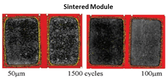 傳統(tǒng)焊料在高溫波動(dòng)及高功率循環(huán)條件下易產(chǎn)生疲勞效應(yīng),導(dǎo)致連接層失效,從而影響模塊的使用壽命。燒結(jié)銀技術(shù),通過提高連接層的強(qiáng)度和穩(wěn)定性,有效延長(zhǎng)了功率模塊的使用壽命。