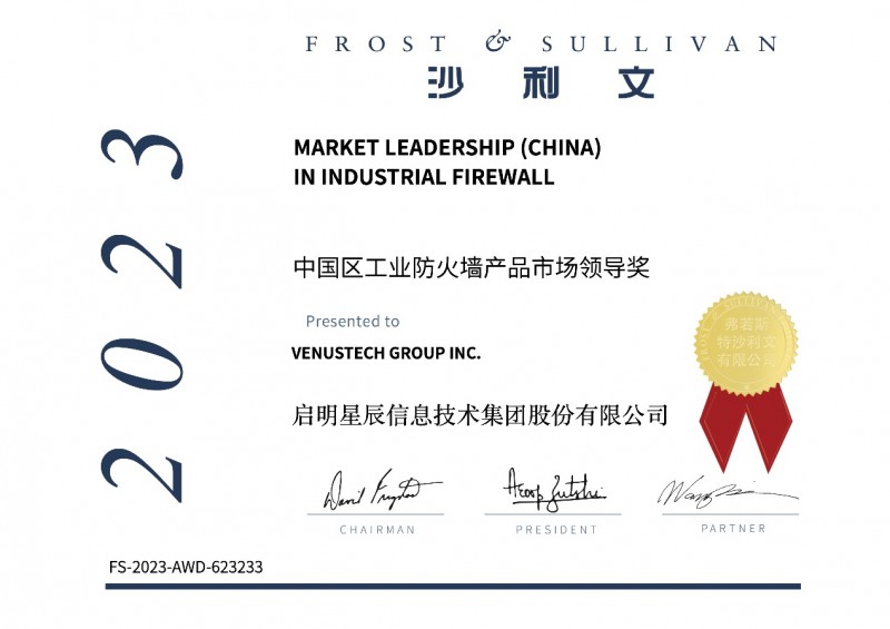 本網(wǎng)訊 近日,弗若斯特沙利文(Frost & Sullivan,以下簡稱“沙利文”)正式發(fā)布2023年中國工業(yè)防火墻市場排名,啟明星辰集團工業(yè)防火墻以36.7%的市場份額雄踞榜首,并再次榮獲“2023年度中國區(qū)工業(yè)防火墻產(chǎn)品市場領(lǐng)導獎”。至此,啟明星辰集團已連續(xù)六年領(lǐng)跑中國工業(yè)防火墻市場。