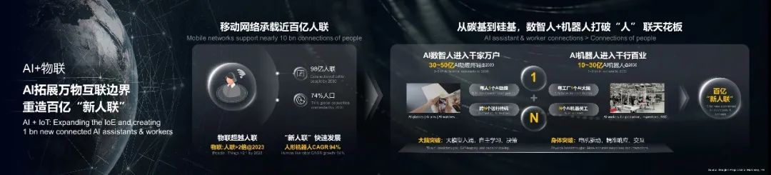 第三,移動(dòng)AI時(shí)代將極大拓展萬物互聯(lián)的邊界。隨著機(jī)器獲得類人的思維和移動(dòng)性能力,網(wǎng)絡(luò)聯(lián)接將從“碳基人”拓展到“硅基人”,再造百億新人聯(lián)。對(duì)于個(gè)人,未來每個(gè)人都將擁有一個(gè)AI助理,跨手機(jī)、眼鏡和新型AI終端運(yùn)行。AI數(shù)智人從工具進(jìn)化為伙伴,實(shí)時(shí)響應(yīng)生活、工作、學(xué)習(xí)全場景需求;對(duì)于行業(yè),每一個(gè)智慧工廠將配備AI大腦,驅(qū)動(dòng)AI機(jī)器員工深入各生產(chǎn)環(huán)節(jié)。AI機(jī)器員工將具備自主學(xué)習(xí)和精準(zhǔn)響應(yīng)的能力,使能生產(chǎn)、維護(hù)、質(zhì)檢、物流等全場景提質(zhì)增效。“數(shù)智人”和“機(jī)器人”將突破傳統(tǒng)聯(lián)接天花板,創(chuàng)造數(shù)百億的“新人聯(lián)”,引領(lǐng)人機(jī)融合的新紀(jì)元。