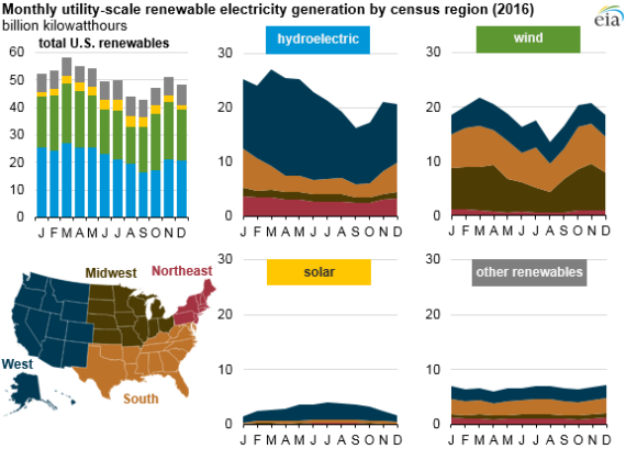 從發(fā)電量來看,今年3月份,美國可再生能源發(fā)電量達到全年最高。從地方來看,大部分可再生能源來自西部地區(qū),尤其是水電(占63%)和太陽能發(fā)電(占77%)。風電產(chǎn)業(yè)相對發(fā)展比較均衡,中部地區(qū)占37%,南部占35%,西部占24%,東北部地區(qū)占4%。