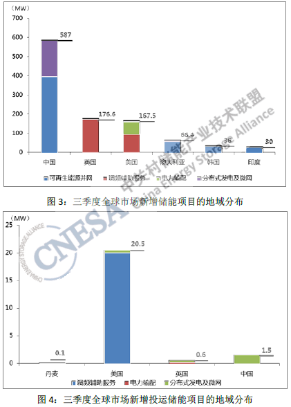 新增投運項目中,美國的裝機規(guī)模最大,為20.5MW,占三季度新增投運項目裝機總規(guī)模的90%,項目幾乎全部應用于調(diào)頻輔助服務領域。